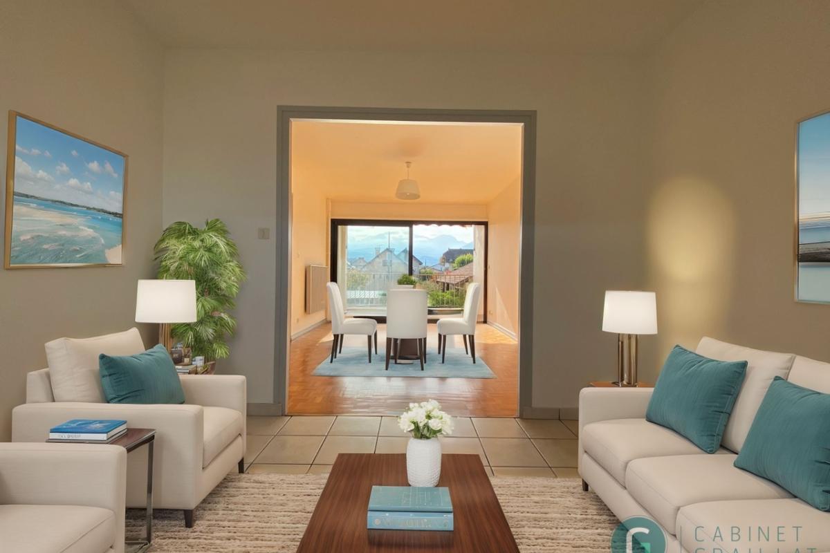 EXCLUSIVITE - Ce bien de 72 m², baigné de lumière, au calme dans un endroit agréable à vivre. Double séjour avec parquet, spacieux et lumineux ouvrant sur une petite terrasse exposée plein sud, idéale pour profiter du soleil tout au long de la journée. Superbe vue sur les massifs montagneux. Cuisine. 2 Chambres avec parquet. Salle d’eau. Pour les aspects pratiques, cet appartement comprend un garage, une cave et une place de parking réservée, garantissant ainsi des solutions de rangement et de stationnement aisées. Dernier étage sans asc 3/3, Etages facile à monter. Dans le charges sont compris : le chauffage, l'eau chaude, le gaz de cuisson, l'entretient & le paysagiste. Prévoir rafraîchissement.